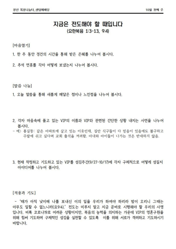 2020년 10월 4일 나눔터(목원용) 센텀예배당