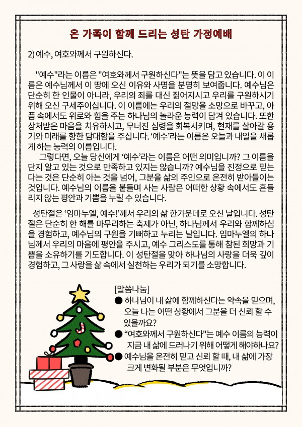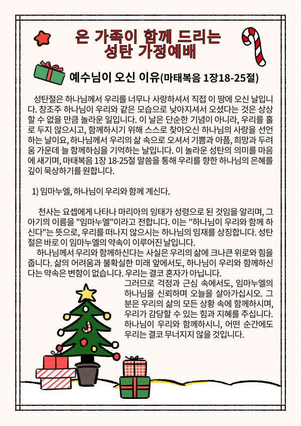 2024년 성탄 가정예배 페이지 정보 작성자 관리지기 작성일24-12-21 11:50 조회5,479회 댓글0건 관련링크 이전글 다음글 목록 본문 2024년 성탄 가정예배 댓글목록 등록된 댓글이 없습니다. 이전글 다음글 목록