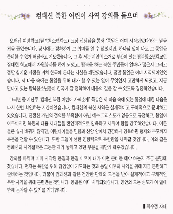 컴패션 북한 어린이 사역 강의를 들으며_최수정 자매