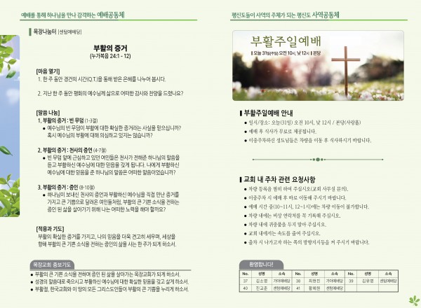 2024년 3월 31일 주보 (센텀예배당) 페이지 정보 작성자 관리지기 작성일24-03-30 10:39 조회2,563회 댓글0건 관련링크 목록 본문 2024년 3월 31일 주보 (센텀예배당) 댓글목록 등록된 댓글이 없습니다. 목록