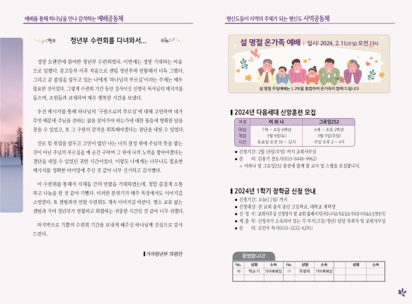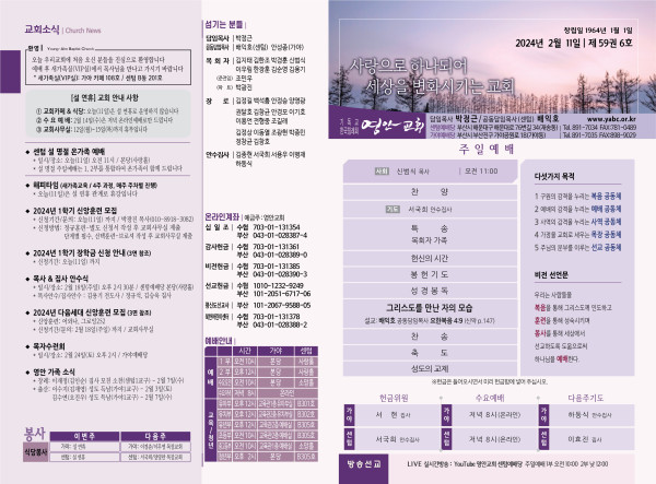 2024년 2월 11일 주보 (센텀예배당) 페이지 정보 작성자 관리지기 작성일24-02-08 13:16 조회2,778회 댓글0건 관련링크 목록 본문 2024년 2월 11일 주보 (센텀예배당) 댓글목록 등록된 댓글이 없습니다. 목록