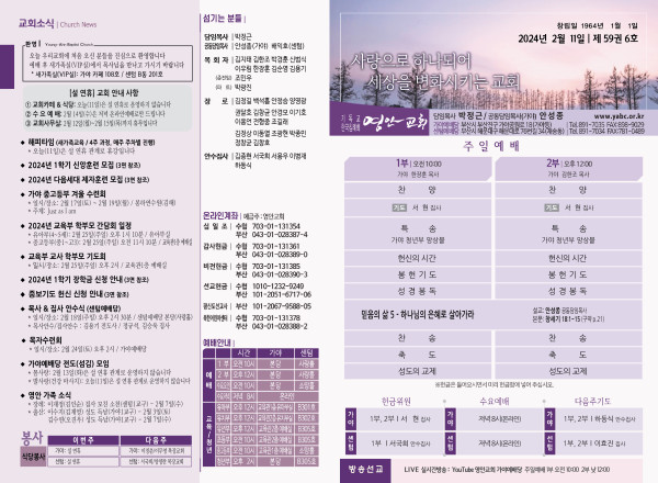2024년 2월 11일 주보 (가야예배당) 페이지 정보 작성자 관리지기 작성일24-02-08 22:39 조회3,183회 댓글0건 관련링크 목록 본문 2024년 2월 11일 주보 (가야예배당) 댓글목록 등록된 댓글이 없습니다. 목록