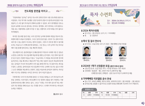 2024년 2월 18일 주보 (가야예배당) 페이지 정보 작성자 관리지기 작성일24-02-17 12:07 조회2,752회 댓글0건 관련링크 목록 본문 2024년 2월 18일 주보 (가야예배당) 댓글목록 등록된 댓글이 없습니다. 목록