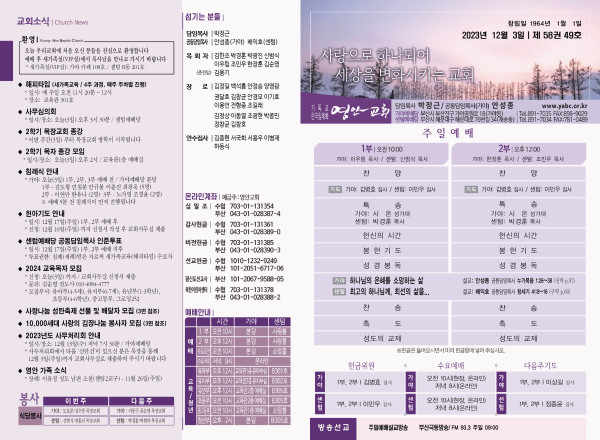 2023년 12월 3일 주보 (가야예배당) 페이지 정보 작성자 관리지기 작성일23-12-02 12:09 조회3,376회 댓글0건 관련링크 목록 본문 * 2023년 12월 3일 주보 (가야예배당) 댓글목록 등록된 댓글이 없습니다. 목록