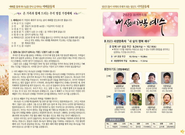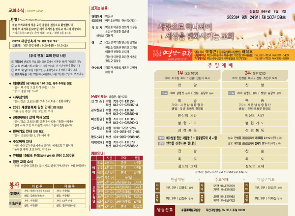 2023년 9월 24일 주보 (센텀예배당) 페이지 정보 작성자 관리지기 작성일23-09-23 10:17 조회3,083회 댓글0건 관련링크 목록 본문 2023년 9월 24일 주보 (센텀예배당) 댓글목록 등록된 댓글이 없습니다. 목록