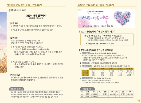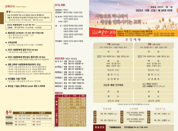 2023년 10월 22일 주보 (센텀예배당) 페이지 정보 작성자 관리지기 작성일23-10-21 09:56 조회2,972회 댓글0건 관련링크 목록 본문 2023년 10월 22일 주보 (센텀예배당) 댓글목록 등록된 댓글이 없습니다. 목록