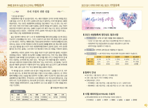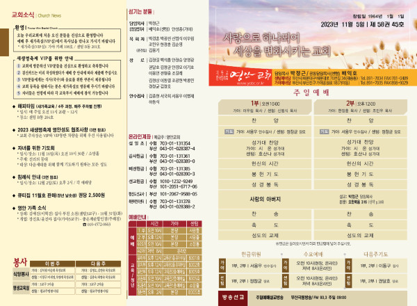2023년 11월 5일 주보 (센텀예배당) 페이지 정보 작성자 관리지기 작성일23-11-04 10:48 조회3,033회 댓글0건 관련링크 목록 본문 2023년 11월 5일 주보 (센텀예배당) 댓글목록 등록된 댓글이 없습니다. 목록
