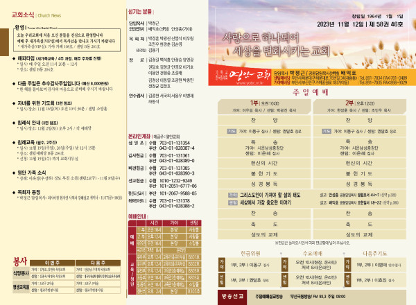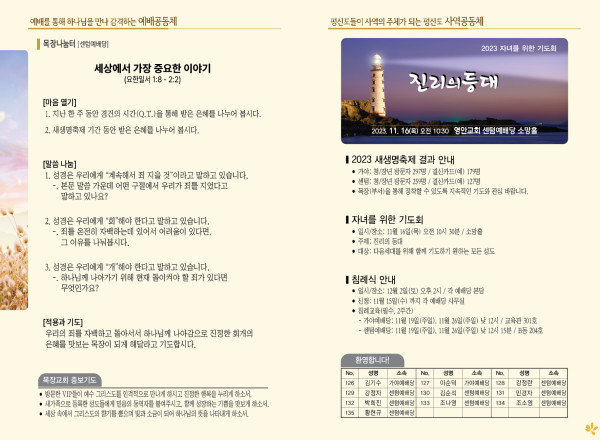 2023년 11월 12일 주보 (센텀예배당) 페이지 정보 작성자 관리지기 작성일23-11-11 11:17 조회3,221회 댓글0건 관련링크 목록 본문 * 2023년 11월 12일 주보 (센텀예배당) 댓글목록 등록된 댓글이 없습니다. 목록