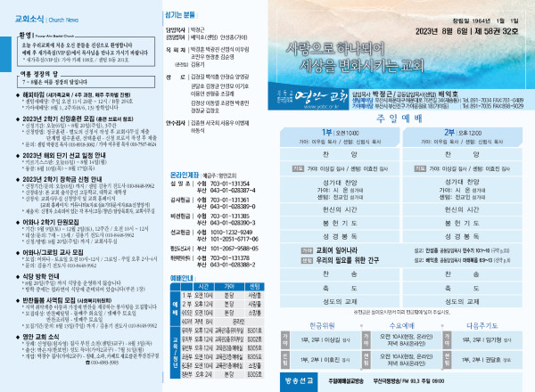2023년 8월 6일 주보 (센텀예배당) 페이지 정보 작성자 관리지기 작성일23-08-05 09:53 조회3,203회 댓글0건 관련링크 목록 본문 2023년 8월 6일 주보 (센텀예배당) 댓글목록 등록된 댓글이 없습니다. 목록