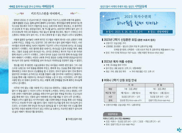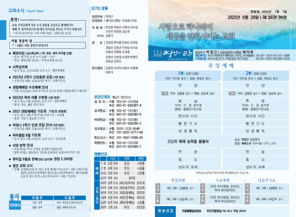 2023년 8월 20일 주보 (센텀예배당) 페이지 정보 작성자 관리지기 작성일23-08-19 10:09 조회3,248회 댓글0건 관련링크 목록 본문 2023년 8월 20일 주보 (센텀예배당) 댓글목록 등록된 댓글이 없습니다. 목록