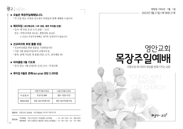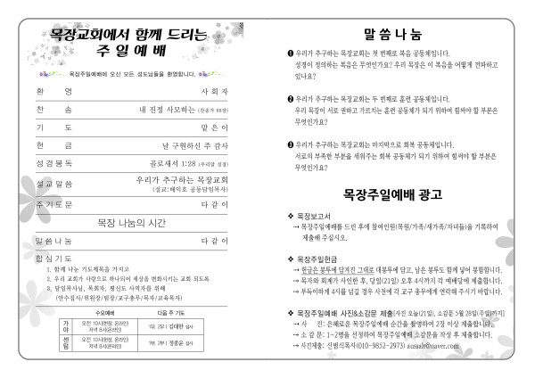 2023년 5월 21일 주보 (센텀예배당)_목장주일예배 페이지 정보 작성자 관리지기 작성일23-05-20 10:17 조회3,350회 댓글0건 관련링크 목록 본문 2023년 5월 21일 주보 (센텀예배당)_목장주일예배 댓글목록 등록된 댓글이 없습니다. 목록