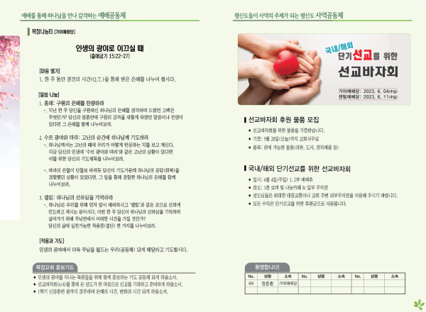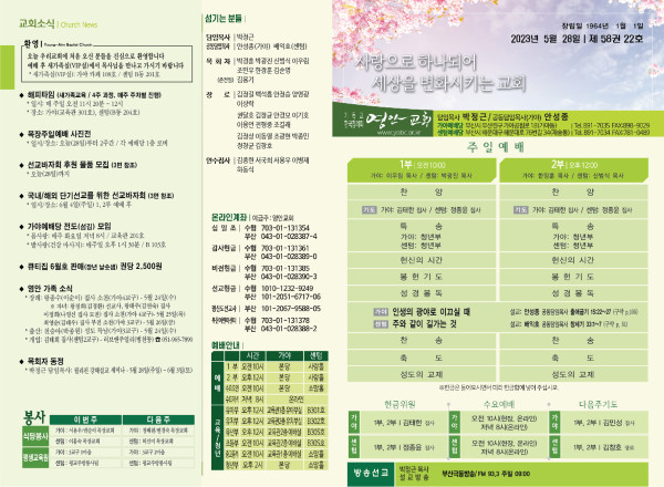 2023년 5월 28일 주보 (가야예배당) 페이지 정보 작성자 관리지기 작성일23-05-27 13:33 조회3,580회 댓글0건 관련링크 목록 본문 * 2023년 5월 28일 주보 (가야예배당) 댓글목록 등록된 댓글이 없습니다. 목록