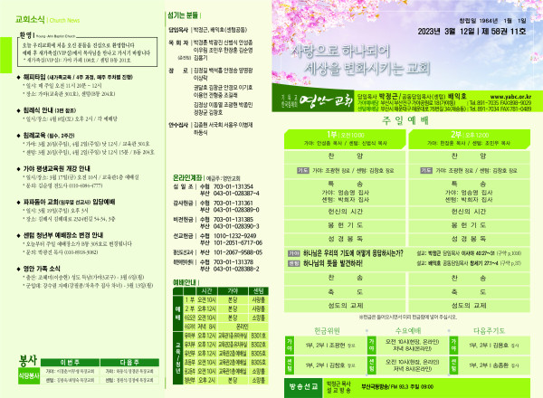 2023년 3월 12일 주보 (센텀예배당) 페이지 정보 작성자 관리지기 작성일23-03-11 11:04 조회3,939회 댓글0건 관련링크 목록 본문 2023년 3월 12일 주보 (센텀예배당) 댓글목록 등록된 댓글이 없습니다. 목록
