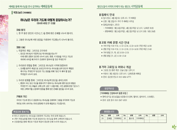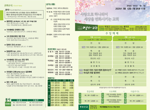 2023년 3월 12일 주보 (가야 예배당) 페이지 정보 작성자 관리지기 작성일23-03-11 11:12 조회4,275회 댓글0건 관련링크 목록 본문 * 2023년 3월 12일 주보 (가야 예배당) 댓글목록 등록된 댓글이 없습니다. 목록