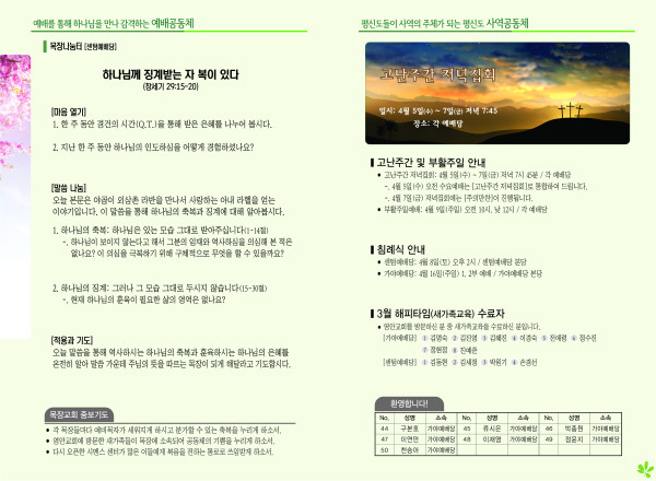 2023년 4월 2일 주보 (센텀예배당) 페이지 정보 작성자 관리지기 작성일23-04-01 11:09 조회3,624회 댓글0건 관련링크 목록 본문 2023년 4월 2일 주보 (센텀예배당) 댓글목록 등록된 댓글이 없습니다. 목록
