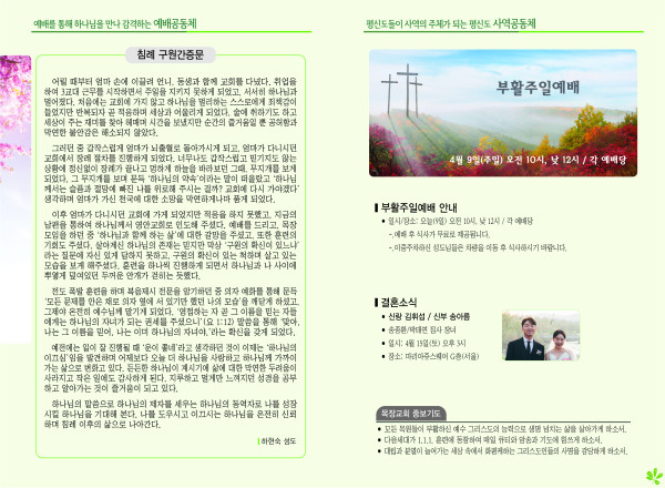 2023년 4월 9일 주보 (센텀예배당) 페이지 정보 작성자 관리지기 작성일23-04-08 11:12 조회3,568회 댓글0건 관련링크 목록 본문 2023년 4월 9일 주보 (센텀예배당) 댓글목록 등록된 댓글이 없습니다. 목록