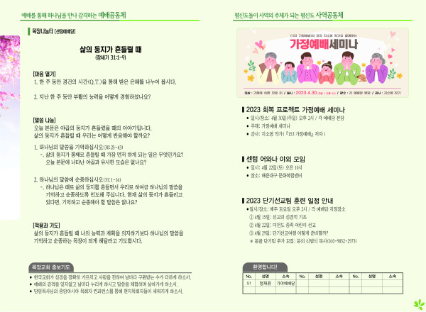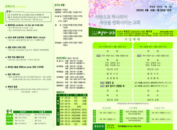 2023년 4월 16일 주보 (센텀예배당) 페이지 정보 작성자 관리지기 작성일23-04-15 11:17 조회3,566회 댓글0건 관련링크 목록 본문 2023년 4월 16일 주보 (센텀예배당) 댓글목록 등록된 댓글이 없습니다. 목록