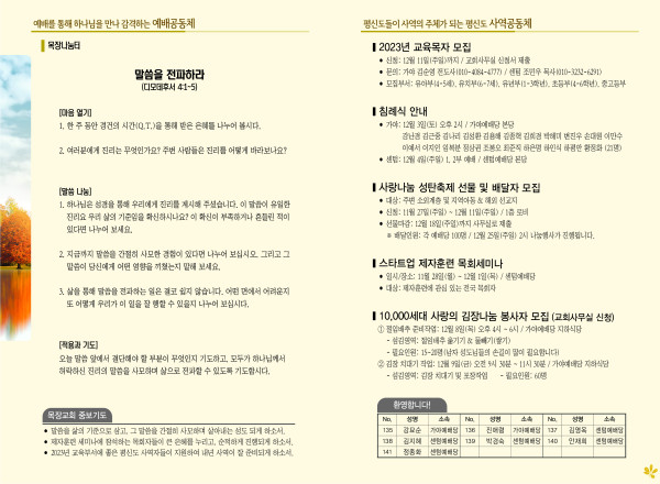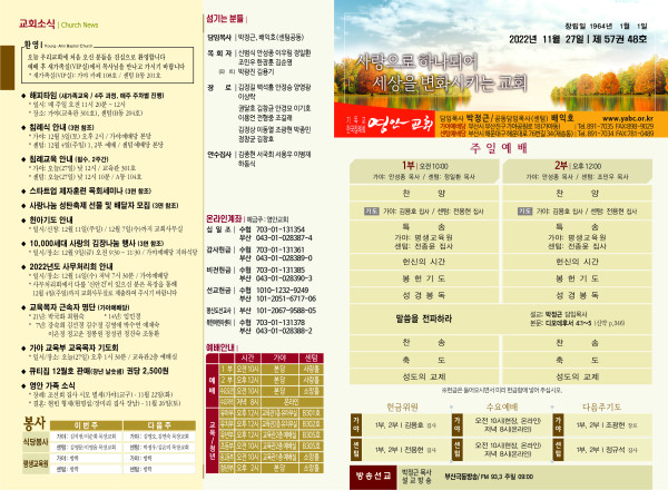 2022년 11월 27일 주보 (가야예배당) 페이지 정보 작성자 관리지기 작성일22-11-26 11:00 조회4,239회 댓글0건 관련링크 목록 본문 2022년 11월 27일 주보 (가야예배당) 댓글목록 등록된 댓글이 없습니다. 목록