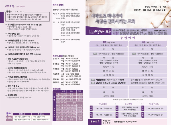2023년 1월 8일 주보 (가야예배당) 페이지 정보 작성자 관리지기 작성일23-01-07 10:46 조회4,131회 댓글0건 관련링크 목록 본문 2023년 1월 8일 주보 (가야예배당) 댓글목록 등록된 댓글이 없습니다. 목록