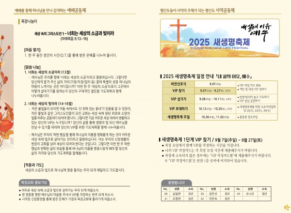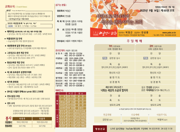2025년 9월 14일 주보 페이지 정보 작성자 관리지기 작성일25-09-13 11:38 조회1,176회 댓글0건 관련링크 목록 본문 2025년 9월 14일 주보 댓글목록 등록된 댓글이 없습니다. 목록