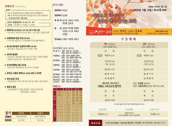 2025년 9월 21일 주보 페이지 정보 작성자 관리지기 작성일25-09-20 10:36 조회1,124회 댓글0건 관련링크 목록 본문 2025년 9월 21일 주보 댓글목록 등록된 댓글이 없습니다. 목록