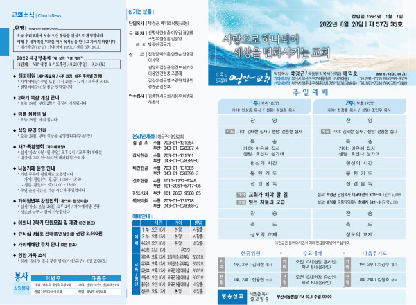 2022년 8월 28일 주보 (가야예배당) 페이지 정보 작성자 관리지기 작성일22-08-27 12:29 조회4,405회 댓글0건 관련링크 목록 본문 * 2022년 8월 28일 주보 (가야예배당) 댓글목록 등록된 댓글이 없습니다. 목록