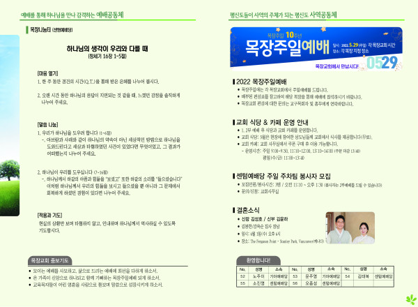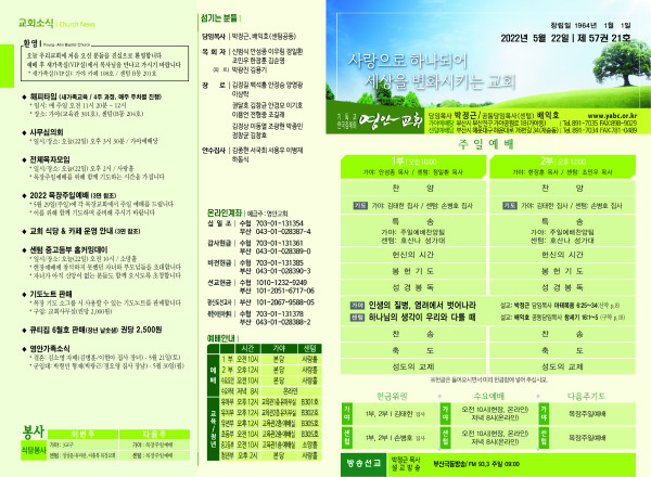 2022년 5월 22일 주보 (센텀예배당) 페이지 정보 작성자 관리지기 작성일22-05-21 11:42 조회4,669회 댓글0건 관련링크 목록 본문 2022년 5월 22일 주보 (센텀예배당) 댓글목록 등록된 댓글이 없습니다. 목록
