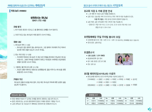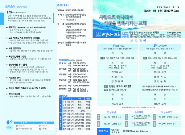 2022년 6월 5일 주보 (센텀예배당) 페이지 정보 작성자 관리지기 작성일22-06-04 11:35 조회4,402회 댓글0건 관련링크 목록 본문 2022년 6월 5일 주보 (센텀예배당) 댓글목록 등록된 댓글이 없습니다. 목록