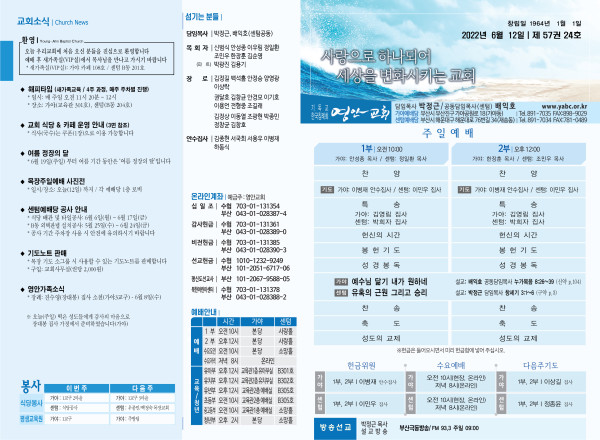 2022년 6월 12일 주보 (가야예배당) 페이지 정보 작성자 관리지기 작성일22-06-11 11:46 조회4,463회 댓글0건 관련링크 목록 본문 * 2022년 6월 12일 주보 (가야예배당) 댓글목록 등록된 댓글이 없습니다. 목록
