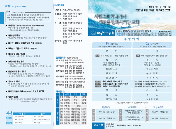 2022년 6월 19일 주보 (가야예배당) 페이지 정보 작성자 관리지기 작성일22-06-18 12:53 조회4,670회 댓글0건 관련링크 목록 본문 * 2022년 6월 19일 주보 (가야예배당) 댓글목록 등록된 댓글이 없습니다. 목록