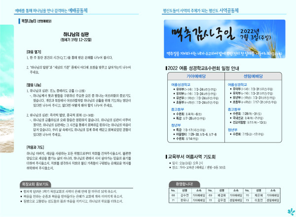 2022년 6월 26일 주보 (센텀예배당) 페이지 정보 작성자 관리지기 작성일22-06-25 11:35 조회4,456회 댓글0건 관련링크 목록 본문 2022년 6월 26일 주보 (센텀예배당) 댓글목록 등록된 댓글이 없습니다. 목록