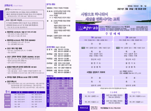 2021년 2월 28일 주보 페이지 정보 작성자 관리지기 작성일21-02-27 12:08 조회6,632회 댓글0건 관련링크 목록 본문 *2021년 2월 28일 주보 댓글목록 등록된 댓글이 없습니다. 목록