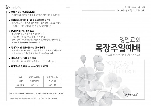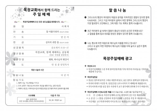 2025년 5월 25일 주보 페이지 정보 작성자 관리지기 작성일25-05-24 09:53 조회1,666회 댓글0건 관련링크 목록 본문 2025년 5월 25일 주보 댓글목록 등록된 댓글이 없습니다. 목록