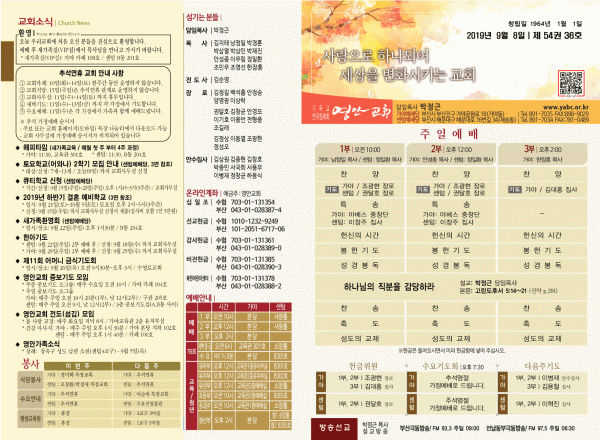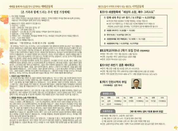 2019년 9월 8일 주보 페이지 정보 작성자 관리지기 작성일19-09-07 12:00 조회8,358회 댓글0건 관련링크 목록 본문 [2019년 9월 8일 주보] 댓글목록 등록된 댓글이 없습니다. 목록