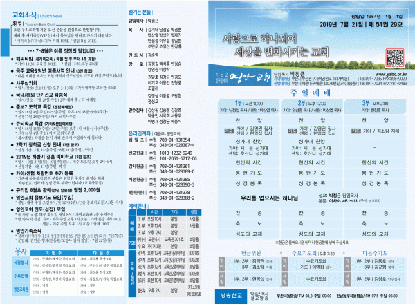 2019년 7월 21일 주보 페이지 정보 작성자 관리지기 작성일19-07-20 11:59 조회8,709회 댓글0건 관련링크 목록 본문 [2019년 7월 21일 주보] 댓글목록 등록된 댓글이 없습니다. 목록