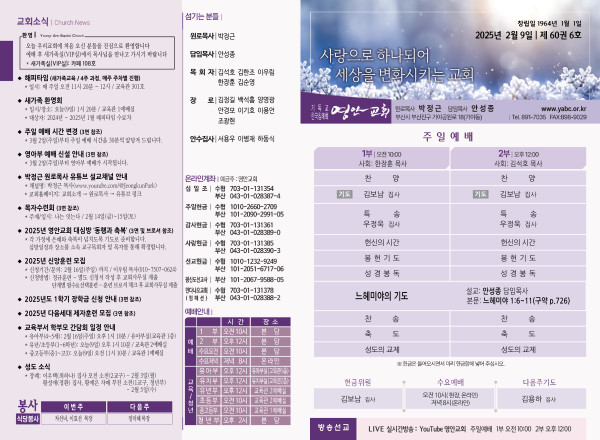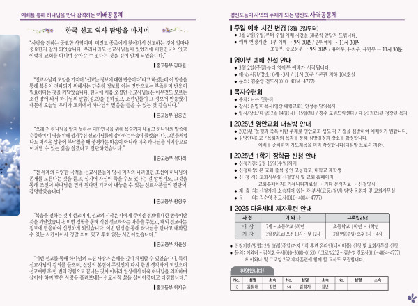 2025년 2월 9일 주보 페이지 정보 작성자 관리지기 작성일25-02-08 11:09 조회2,074회 댓글0건 관련링크 목록 본문 2025년 2월 9일 주보 댓글목록 등록된 댓글이 없습니다. 목록