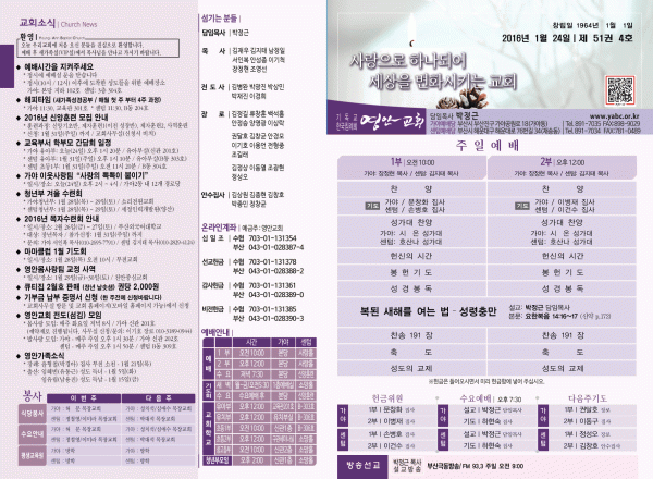 2016년 1월 24일 주보 페이지 정보 작성자 영안교회 작성일16-01-23 13:26 조회13,489회 댓글0건 관련링크 목록 본문 2016년 1월 24일 주보 댓글목록 등록된 댓글이 없습니다. 목록