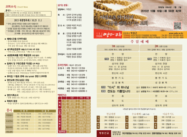 2015년 10월 18일 주보 페이지 정보 작성자 영안교회 작성일15-10-21 14:27 조회9,991회 댓글0건 관련링크 목록 본문 2015년 10월 18일 주보 댓글목록 등록된 댓글이 없습니다. 목록