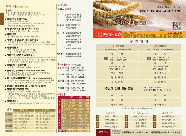 2015년 11월 22일 주보 페이지 정보 작성자 영안교회 작성일15-11-21 14:10 조회10,316회 댓글0건 관련링크 목록 본문 2015년 11월 22일 주보 댓글목록 등록된 댓글이 없습니다. 목록