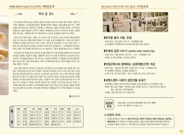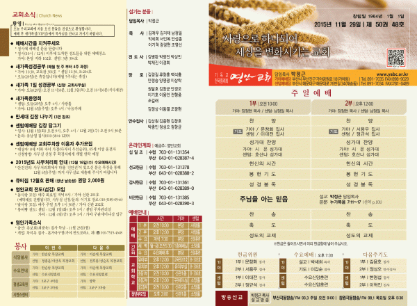 2015년 11월 29일 주보 페이지 정보 작성자 영안교회 작성일15-11-28 12:29 조회12,166회 댓글0건 관련링크 목록 본문 2015년 11월 29일 주보 댓글목록 등록된 댓글이 없습니다. 목록