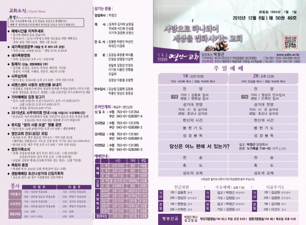 2015년 12월 6일 주보 페이지 정보 작성자 영안교회 작성일15-12-05 13:47 조회10,552회 댓글0건 관련링크 목록 본문 2015년 12월 6일 주보 댓글목록 등록된 댓글이 없습니다. 목록
