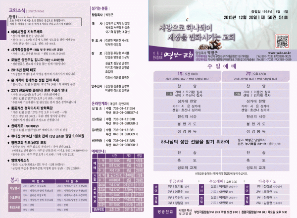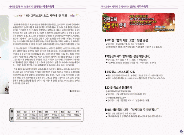 2015년 12월 20일 주보 페이지 정보 작성자 영안교회 작성일15-12-19 12:24 조회11,177회 댓글0건 관련링크 목록 본문 2015년 12월 20일 주보 댓글목록 등록된 댓글이 없습니다. 목록