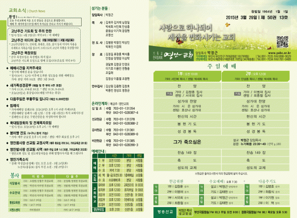 2015년 3월 29일 주보 페이지 정보 작성자 yabc 작성일15-03-28 00:00 조회10,257회 댓글0건 관련링크 목록 본문 2015년 3월 29일 주보 댓글목록 등록된 댓글이 없습니다. 목록