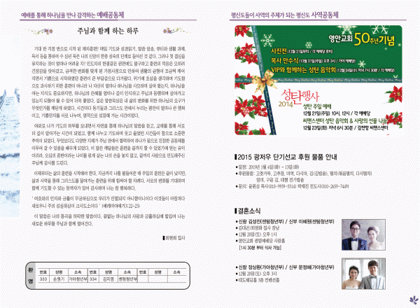 2014년 12월 14일 주보 페이지 정보 작성자 yabc 작성일14-12-13 00:00 조회9,755회 댓글0건 관련링크 목록 본문 2014년 12월 14일 주보 댓글목록 등록된 댓글이 없습니다. 목록