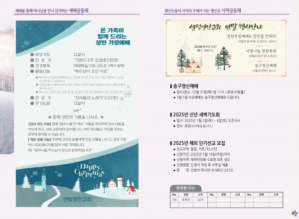 2024년 12월 22일 주보 (센텀예배당) 페이지 정보 작성자 관리지기 작성일24-12-21 11:04 조회2,046회 댓글0건 관련링크 목록 본문 2024년 12월 22일 주보 (센텀예배당) 댓글목록 등록된 댓글이 없습니다. 목록