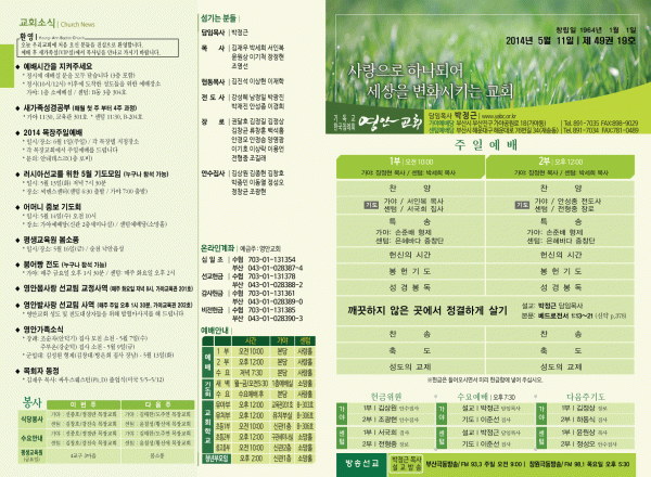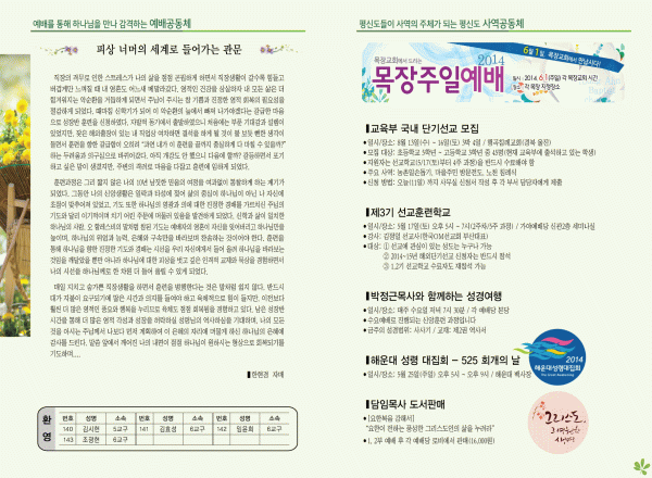 2014년 5월 11일 주보 페이지 정보 작성자 yabc 작성일14-05-10 00:00 조회10,094회 댓글0건 관련링크 목록 본문 2014년 5월 11일 주보 댓글목록 등록된 댓글이 없습니다. 목록