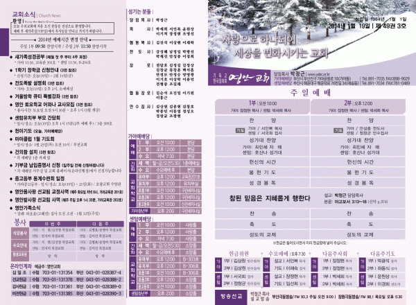 2014년 1월 19일 주보 페이지 정보 작성자 yabc 작성일14-01-18 00:00 조회11,058회 댓글0건 관련링크 목록 본문 2014년 1월 19일 주보 댓글목록 등록된 댓글이 없습니다. 목록