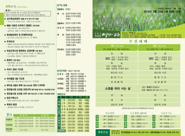 2014년 3월 23일 주보 페이지 정보 작성자 yabc 작성일14-03-22 00:00 조회10,568회 댓글0건 관련링크 목록 본문 2014년 3월 23일 주보 댓글목록 등록된 댓글이 없습니다. 목록