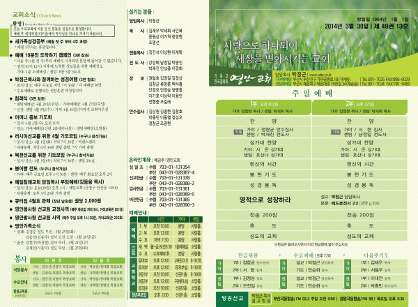 2014년 3월 30일 주보 페이지 정보 작성자 yabc 작성일14-03-29 00:00 조회10,315회 댓글0건 관련링크 목록 본문 2014년 3월 30일 주보 댓글목록 등록된 댓글이 없습니다. 목록