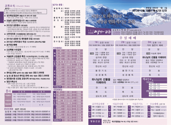 2012년 12월 23일 주보 페이지 정보 작성자 yabc 작성일12-12-22 00:00 조회10,544회 댓글0건 관련링크 목록 본문 2012년 12월 23일 주보 댓글목록 등록된 댓글이 없습니다. 목록
